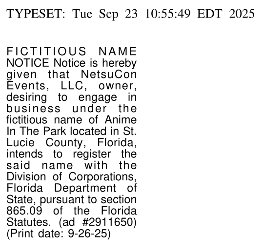 This newspaper article serves to inform the public that NetsuCon Events, LLC will be doing business as Anime in the Park.