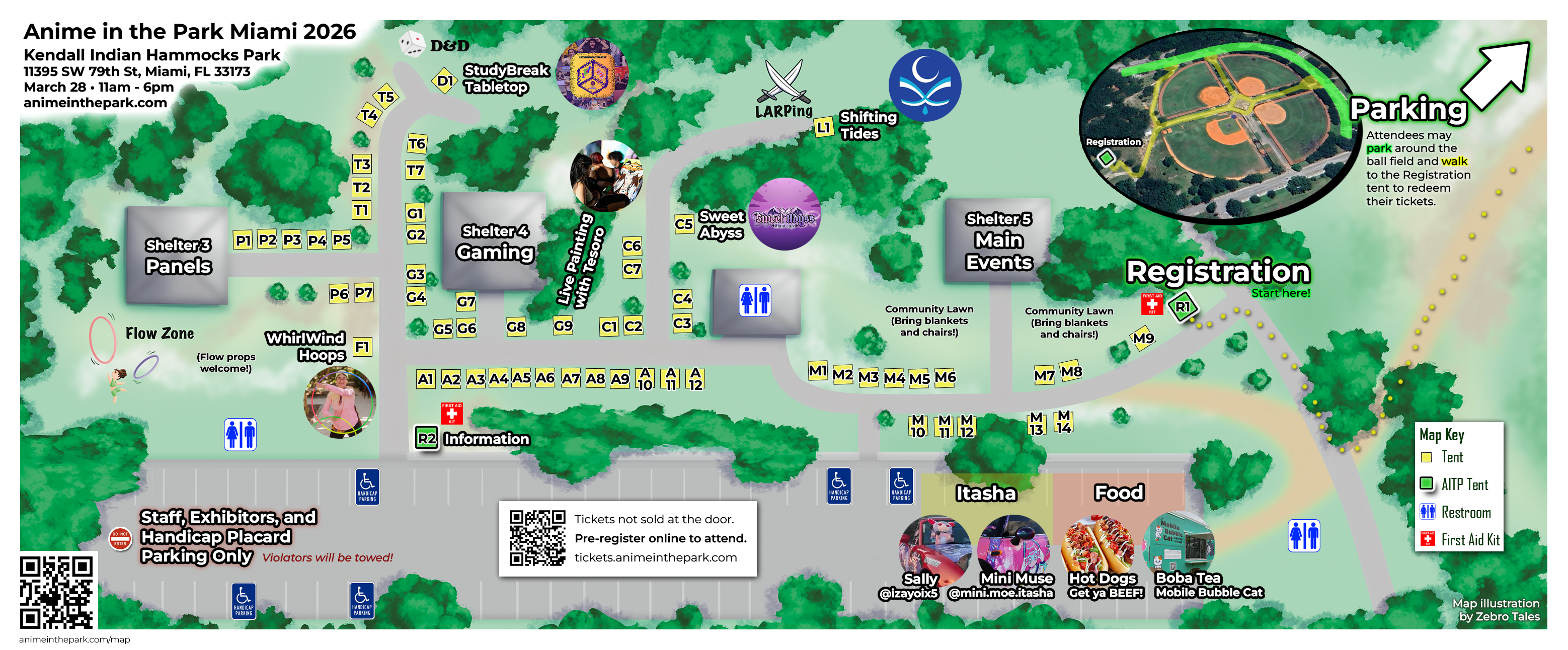 Please note that the parking lot south of the Main Event Area will be CLOSED, and anyone who parks there without a staff pass will be towed. If you need special accommodations, such as additional handicap parking, just let us know.